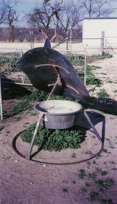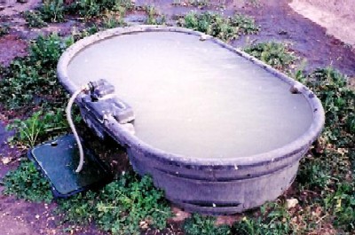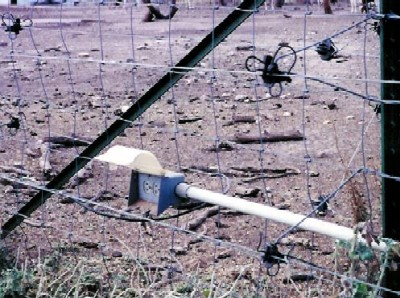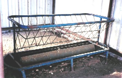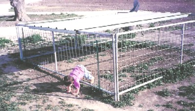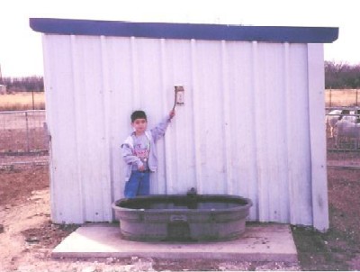have included lots of pictures to illustrate what I'm writing about. Most of the equipment and facilities pictured are from my ranch in West Central Texas. Depending on your location and the local climate, you may need different or additional equipment and facilities to accommodate your needs. Transportation If you are raising goats you will eventually have a need to move them further than you care to herd them. For large quantities of goats a trailer will be necessary, however, smaller numbers can easily be transported in the bed of a pickup. To prevent the goats from jumping out you can use either a goat tote or a topper. A goat tote is basically a cage made with a galvanized pipe frame and 4" welded wire mesh top and sides. During cold and/or wet weather the goat tote can be covered with canvas or nylon to keep the wind and rain out. Goat totes are suitable for carrying a couple of goats, and will allow you to use a portion of the bed for other items since the totes are typically smaller than the bed of a pickup. The other option is to use a topper. A topper is a fiberglass or aluminum shell that covers the bed of the pickup. They typically have windows that can be opened or closed to regulate the air flow and keep rain out. If you are going to open the windows, you may want to install 4" welded wire mesh over them like I have done in mine to prevent the goats from jumping out. ![]() To install the wire mesh, I first cut it to size using bolt cutters, and then attached it by screwing cable clips to the window frame. Cable clips are J shaped clips that have a hole for a bolt or screw on the flat end, and the curved end is designed to hold a coax cable. You can compress the curved end slightly so it snugly grabs the slightly smaller wire mesh with pliers. You can haul more goats if you use a topper since you will have the use of the entire bed. The bed in my 1989 GMC S-15 pickup is approximately 7.5' by 4.5', and I have transported as many as 25 small (60 lb) or 15 mature goats at a time in there. I wouldn't recommend packing them that tightly on a long trip, but for a 15 minute trip it works ok. For long trips you can comfortably accommodate about 17 small goats or 10 mature ones in a bed that size. Feeders Unless you live in an area where adequate forage is available year round and you are not overstocked, you will need to feed your goats during a portion of each year. You may also need to provide a mineral supplement to them. Good feeders are a necessity to maximize the utilization of the feed and mineral you provide. A good feeder should keep the feed clean and dry until the goats eat it. This requires that the feeder be placed in a building or that it come equipped with a cover. The biggest source of feed contamination is the goats themselves. A good feeder is designed in a way that prevents the goats from climbing in it or pawing the food out of it. The bunk feeders I use in my shelters have been modified for use with goats. I started with a bunk that has a lip around the top that makes it nearly impossible for a goat to paw the feed out of it. This feature is not found on all feeders, but trust me you will be sorry if you buy a bunk feeder that does not have it. ![]() Most bunk feeders available in my area are designed for use with cattle and are too tall for young goats. If you look closely at the photo you will see that I have buried the legs of the feeder in the ground to lower its height making it easier for small goats to eat out of it. Goats love nothing more than to lay in a bunk feeder, and the U shaped bottom of a standard bunk feeder makes a comfortable bed for them. If you allow them to sleep in the feeder, they will stand up from their nap and urinate and defecate all over the feed in the bunk. Once that happens the goats will not eat the feed, and you will have to clean up the mess and give them more feed before they will eat. I have made a couple of modifications to our feeders to prevent this. First, I installed hay racks on shortened supports. The standard height supports are too tall and allow a mature goat to lay underneath them in the feeder. Be careful not to shorten the supports too much. If you shorten the supports too much bucks will not be able to get their heads in the feeders, and will "modify" them for you by knocking out or bending the V's that form the hay rack. Even if the supports are the proper height bucks seem to enjoy tearing the feeders up, so we have a support running across the middle of the V's instead of just attaching them at the top and bottom as is standard with most hay racks I've seen. This greatly strengthens the hay rack and makes damage less likely. Another modification I have planned but have not completed yet, is to add rods spaced every other V that run from close to the bottom of the V's to the lip of the feeder to prevent dominant does from shoving the other does' heads out of the feeder. The second modification I made was to have an inverted V shaped piece of galvanized tin fabricated. I then bolted it to the bottom of the bunk. This prevents all but the smallest kids from laying in the feeder, and directs the feed away from the middle of the feeder, so it is easier for the goats to reach it. During the summer it normally becomes necessary for me to provide feed for the doelings. Since they are in the same pasture as the does I have built a creep pen to house their feeder. In the photo below my 2 year old son Sam demonstrates how the goats exit the feeder. ![]() The sides of the creep pen are 10' long "sheep panels." They are 42" tall, and are made from galvanized tube and 4" welded wire mesh. They are wired together at the sides to form a square, and are also secured to posts driven in the ground. Over the center of the pen I have fabricated a 6'x10' partial roof using a cee purlin frame covered by galvanized steel R panels. The cee purlins fit perfectly over the top of the side panels preventing the roof from sliding off, an